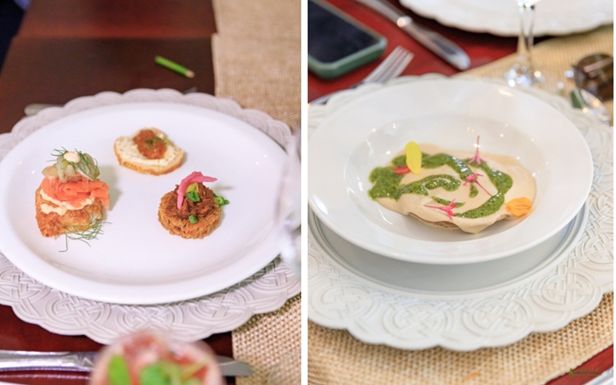 Antes del banquete gastronómico, hubo tiempo para reconocimientos para hombres y mujeres que han hecho de esos 20 años del Clúster Turístico de Constanza una trayectoria memorable. La propuesta de los estudiantes de PUCMM, bajo la dirección de Thelma Yokoyama Kunhardt, resaltó las bondades de la producción agropecuaria constancera. El primer tiempo: crispy rice con salmón picante y pepino encurtido; montadito de papa con pulled pork, guacamole, cebolla encurtida y puerro; crostini con queso fresco y mermelada de níspero. Segundo tiempo: raviolo de remolacha con ratatouille y cremoso de cajuil con pesto.