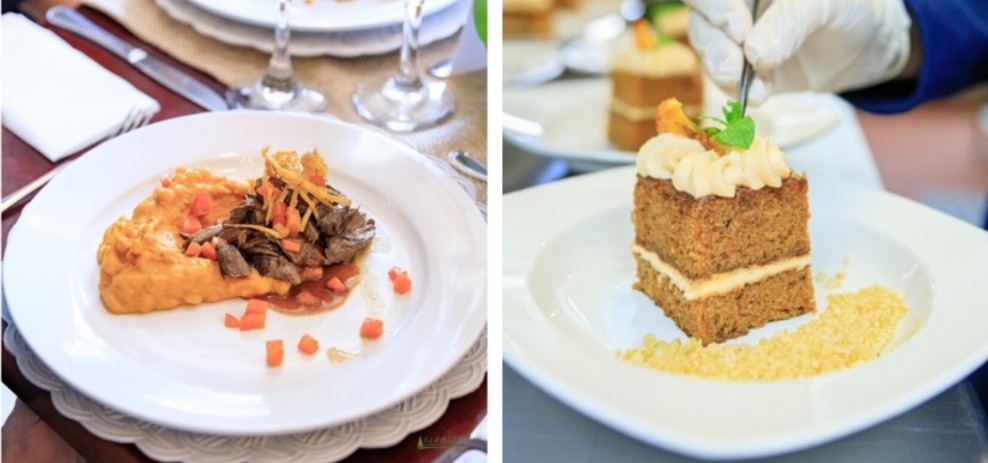 Volvamos a la mesa, los manteles y los cocteles de frutas del bosque cosechadas entre Tireo al Medio y Constanza. Tercer tiempo: ovejo estofado con puré de auyama y maíz, zanahoria confitada y julianas de plátano maduro frito. Cuarto tiempo: carrot cake con frosting de queso crema y crumble de macadamias.